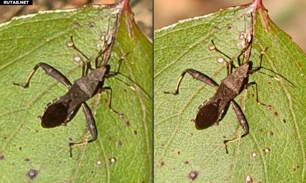 На первый взгляд изображения не выглядят кардинально разными — за исключением различий в эффекте боке. Но при ближайшем рассмотрении обнаруживается явная, разительная разница в детализации — что как раз и является основной задачей телефотокамеры. Текстуры на листе и теле насекомого почти неразличимы на снимке с S Ultra.