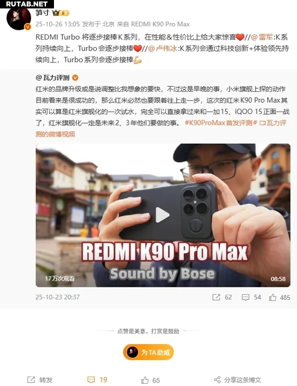 Лу Вэйбинг прокомментировал обзор Redmi K90 Pro, заявив: «Серия K будет продолжать развиваться вверх благодаря технологическим инновациям и лидерству в пользовательском опыте, а серия Turbo постепенно займет ее место».