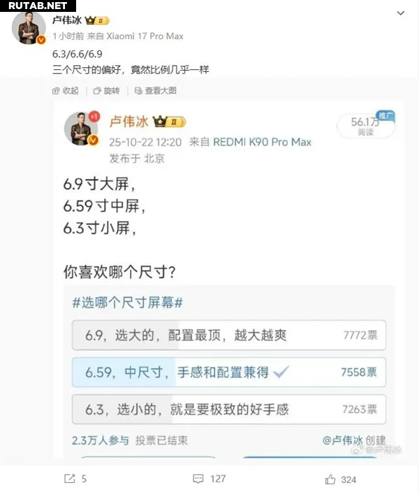 Опрос, инициированный Лу Вейбингом, в котором приняли участие 23 000 человек, показал интересные результаты распределения предпочтений по размерам экранов.