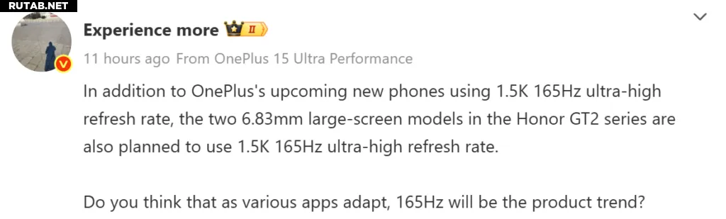 Недавно OnePlus представила OnePlus 15 и Ace 6 как первые смартфоны с дисплеем, поддерживающим частоту обновления 165 Гц. Появились слухи, что OnePlus Ace 6 Turbo, который выйдет позже в этом году, также получит экран с частотой 165 Гц. Новые утечки показывают, что не только OnePlus, но и Honor работает над телефонами с дисплеями такой же высокой частоты.