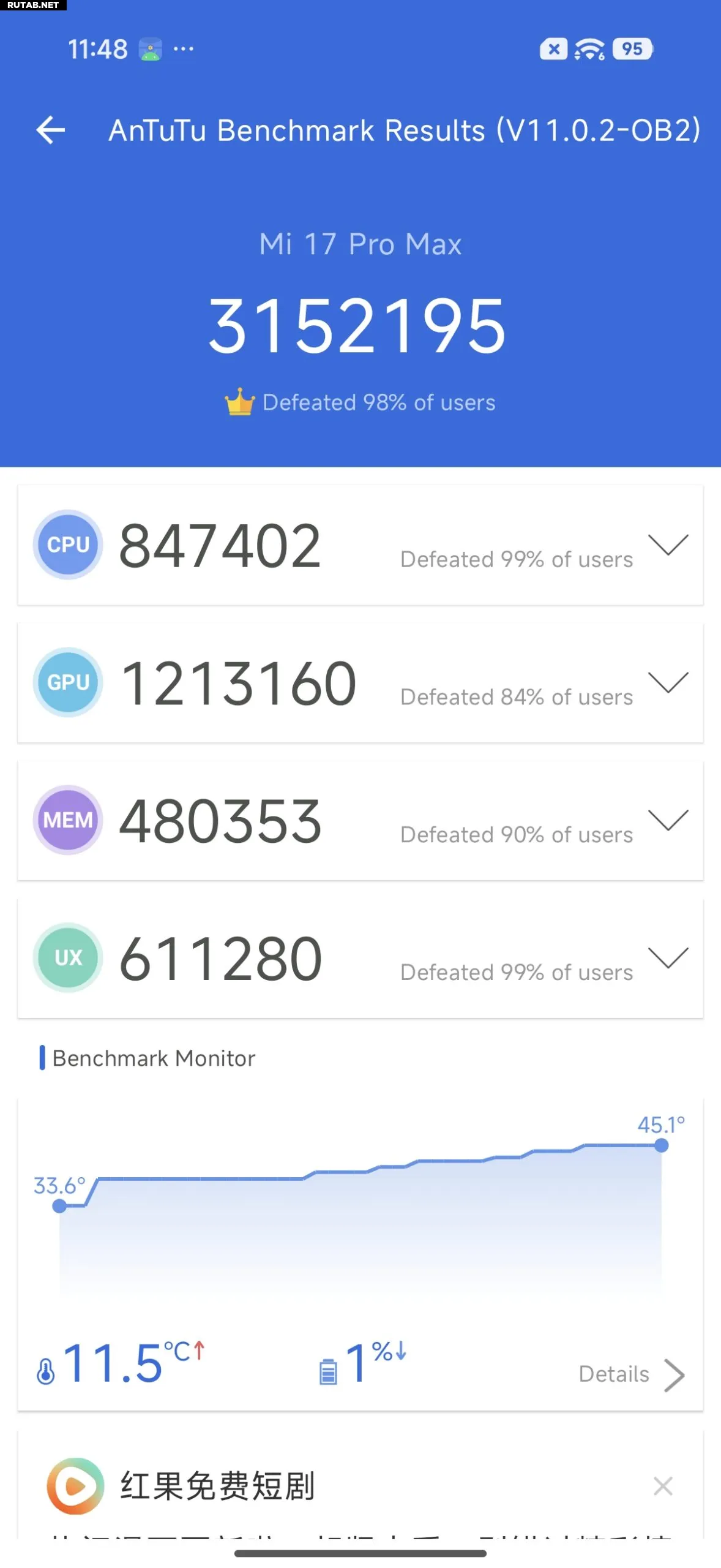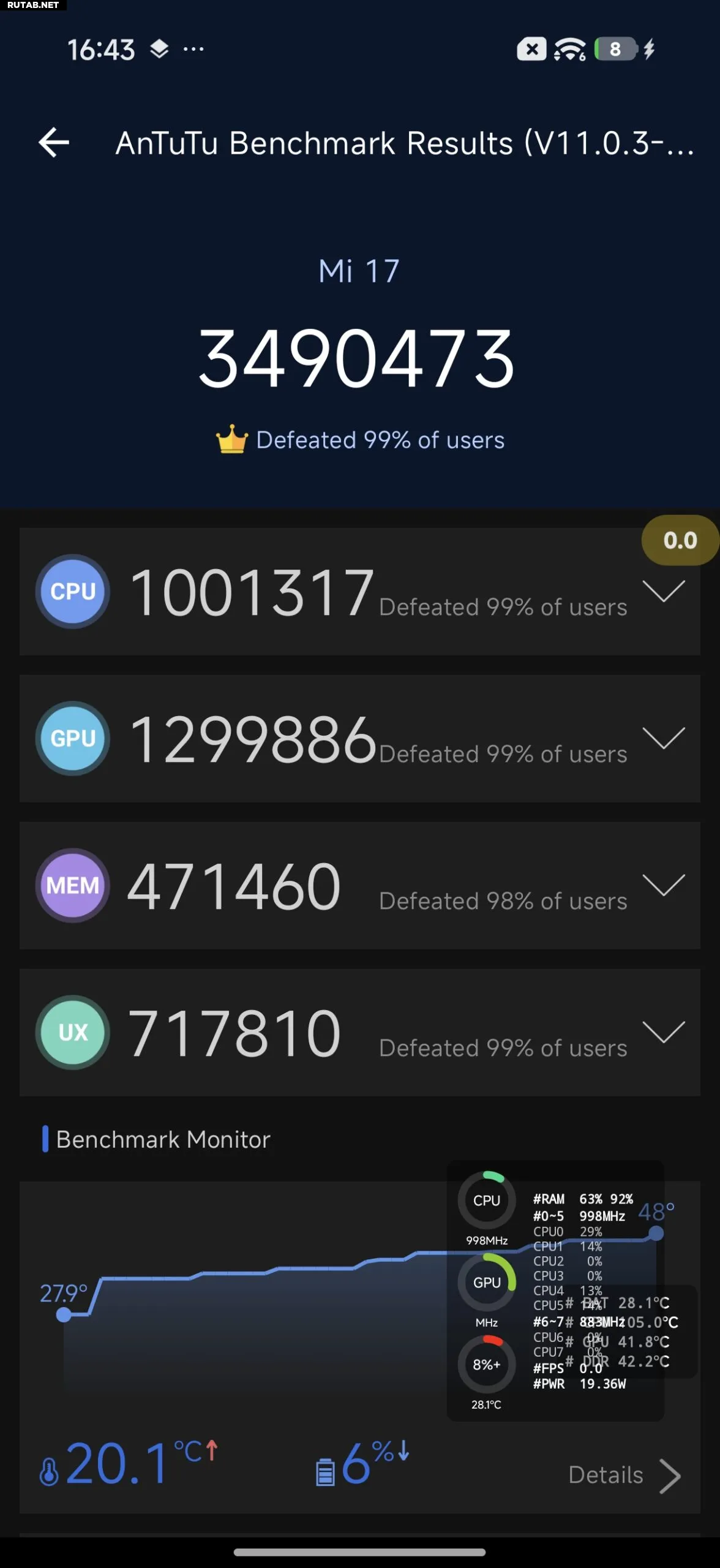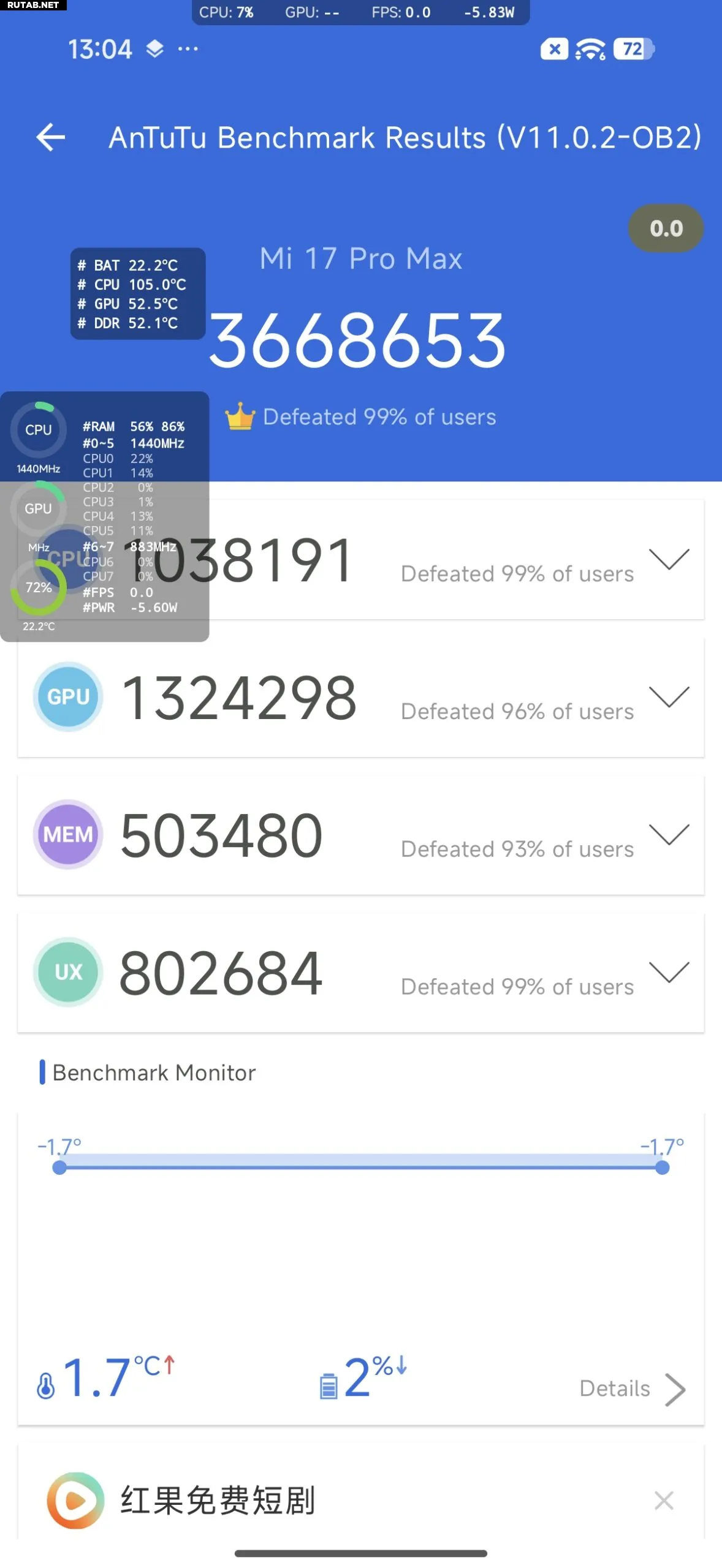 Тесты выявили любопытный нюанс: стандартная модель в синтетическом тесте AnTuTu набирала около 3,5 млн баллов, тогда как Pro Max — только 3,2 млн. Заявленные 3,7 млн баллов достигаются только при экстремальном охлаждении телефона в холодильнике. При этом версия Pro Max потребляет меньше энергии при аналогичных нагрузках.