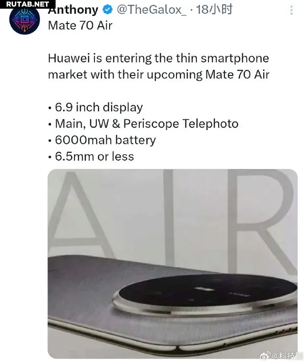 Huawei Mate70 Air с батареей 6000 мАч и толщиной 6,5 мм готовится к выходу