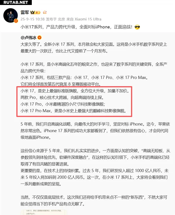 Как пояснил Лу Вэйбиня, серия Xiaomi 17 представляет собой результат пятилетней трансформации компании в премиум-сегменте и ознаменовала ключевые изменения в нумерации моделей с существенным улучшением характеристик.