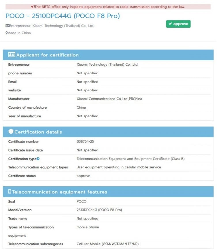 Смартфон Poco F8 Pro получил сертификацию NBTC, что указывает на скорый запуск