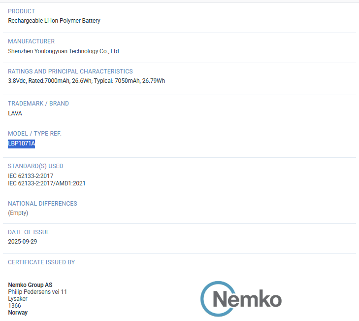 Одновременно с этим литий-ионный аккумулятор с моделью LBP1071A, предназначенный для предстоящего телефона Lava, получил сертификацию Nemko. В списке указана типичная ёмкость 7050 мАч, что позволяет предположить, что он может быть использован в Lava Agni 4.