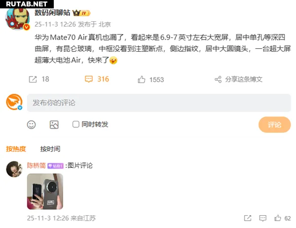 Пользователи в комментариях также поделились реальными фотографиями задней панели Huawei Mate 70 Air. На снимках видна модель SUP-AL90, которая совпадает с данными о Mate 70 Air, ранее появившимися в базе продуктов телеком-оператора.
