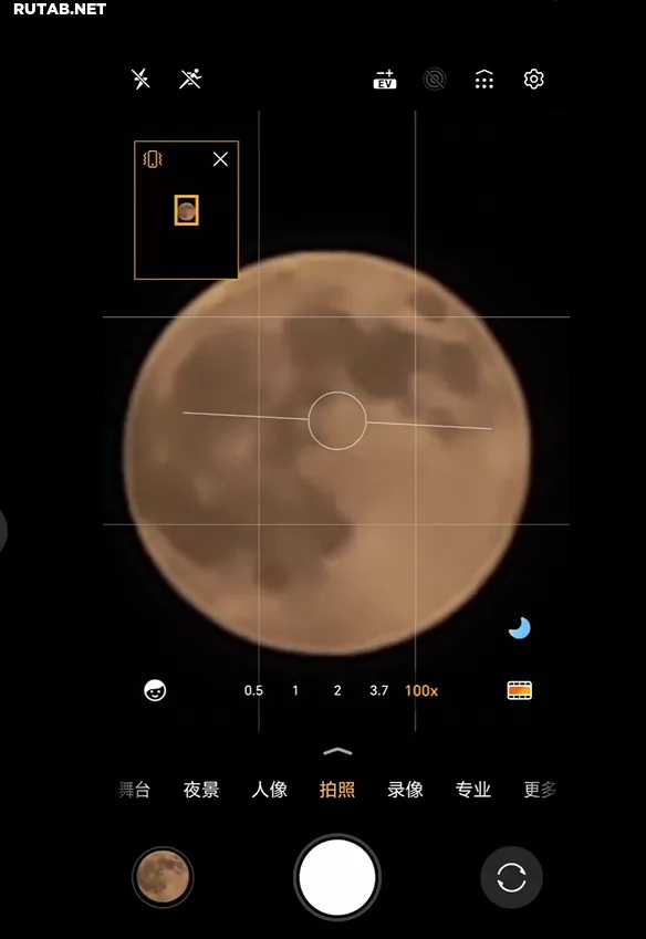 Как видно из видео, при переходе с 3.7-кратного на 100-кратный зум в ручном режиме практически отсутствует заметное дрожание. Луна почти полностью заполняет кадр, а компоновка кадра происходит очень легко.