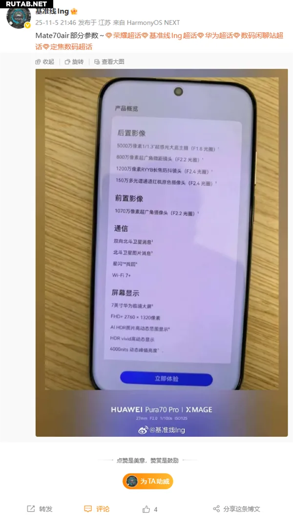 Согласно данным, опубликованным инсайдерами, Huawei Mate 70 Air получит 7-дюймовый дисплей Huawei Immersive Display с разрешением 2760×1320 пикселей, динамической пиковой яркостью 4000 нит и поддержкой технологий AI HDR и HDR Vivid для расширенного динамического диапазона изображения.