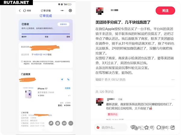 Курьер Meituan сбежал с iPhone 17, купленным пользователем за 6000 юаней