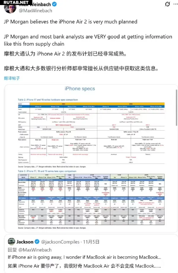 Согласно отчетам инвестиционных банков JPMorgan Chase и TD Cowen, Apple продолжит выпуск смартфона iPhone Air 2 в 2026 году, а в 2027 году планирует переход к третьему поколению устройства. Компания сохраняет прогноз производства на уровне 3 миллионов устройств в третьем квартале и 7 миллионов в четвертом квартале 2025 года.