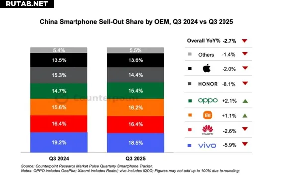 Аналитическая компания Counterpoint Research опубликовала отчёт о доле рынка смартфонов в Китае за третий квартал 2025 года. Согласно данным, vivo сохранила лидерство, несмотря на общее снижение продаж на 2,7% по сравнению с аналогичным периодом прошлого года, что связано с замедлением экономического роста и снижением потребительского спроса.