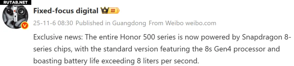По данным инсайдера, вся серия Honor 500 в этот раз будет использовать чипы Snapdragon 8-й серии. Сообщается, что стандартная модель получит Snapdragon 8s Gen 4, а время автономной работы достигнет показателей «восемь с чем-то», что намекает на ёмкость аккумулятора около 8000 мА·ч.