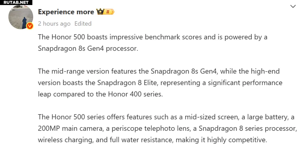Другой инсайдер (Experience More) раскрывает, что Honor 500 Pro будет оснащён чипсетом Snapdragon 8 Elite. Пока неясно, получит ли он также аккумулятор ёмкостью 8000 мА·ч+. Утечка также предполагает, что вся линейка может поддерживать беспроводную зарядку и иметь полную защиту от воды, по-видимому, рейтинг IP68/69.