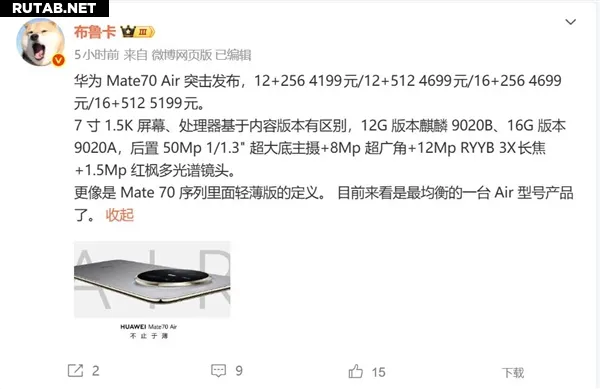 Сотрудник компании Meizu Брука заявил, что Huawei Mate 70 Air больше похож на более тонкую и легкую версию серии Mate 70 и на данный момент является наиболее продуманной моделью Air.