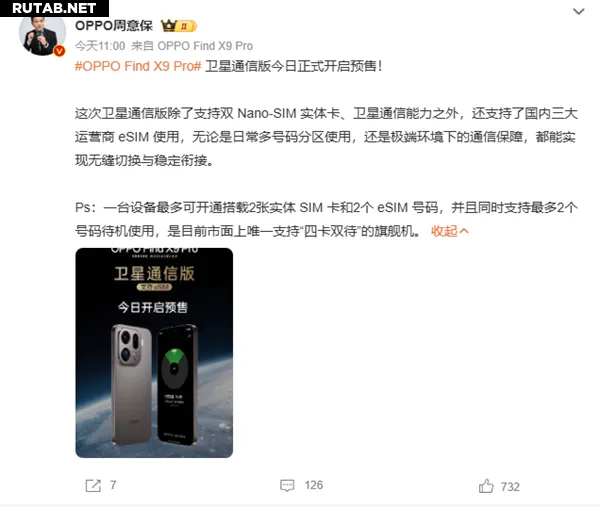 Руководитель продуктовой линейки OPPO Find Чжоу Ибао заявил, что OPPO Find X9 Pro Satellite Communication Edition поддерживает одновременную работу до двух физических SIM-карт и двух eSIM-номеров, при этом могут быть активны до двух номеров одновременно. Это делает его единственным на рынке флагманом с поддержкой технологии «четыре карты, два активных номера».