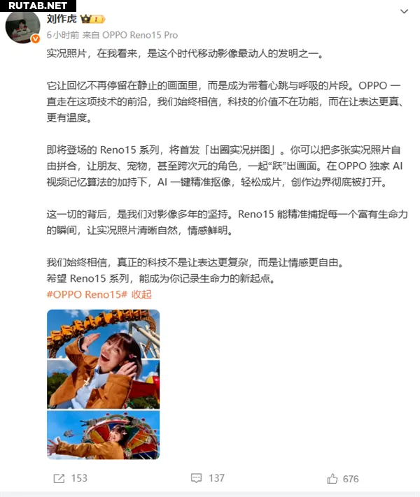 Сегодня главный директор по продукту OPPO Питер Лю (Лю Цзоху) анонсировал, что серия OPPO Reno15 станет первой с функцией «живых коллажей» (出圈实况拼图).