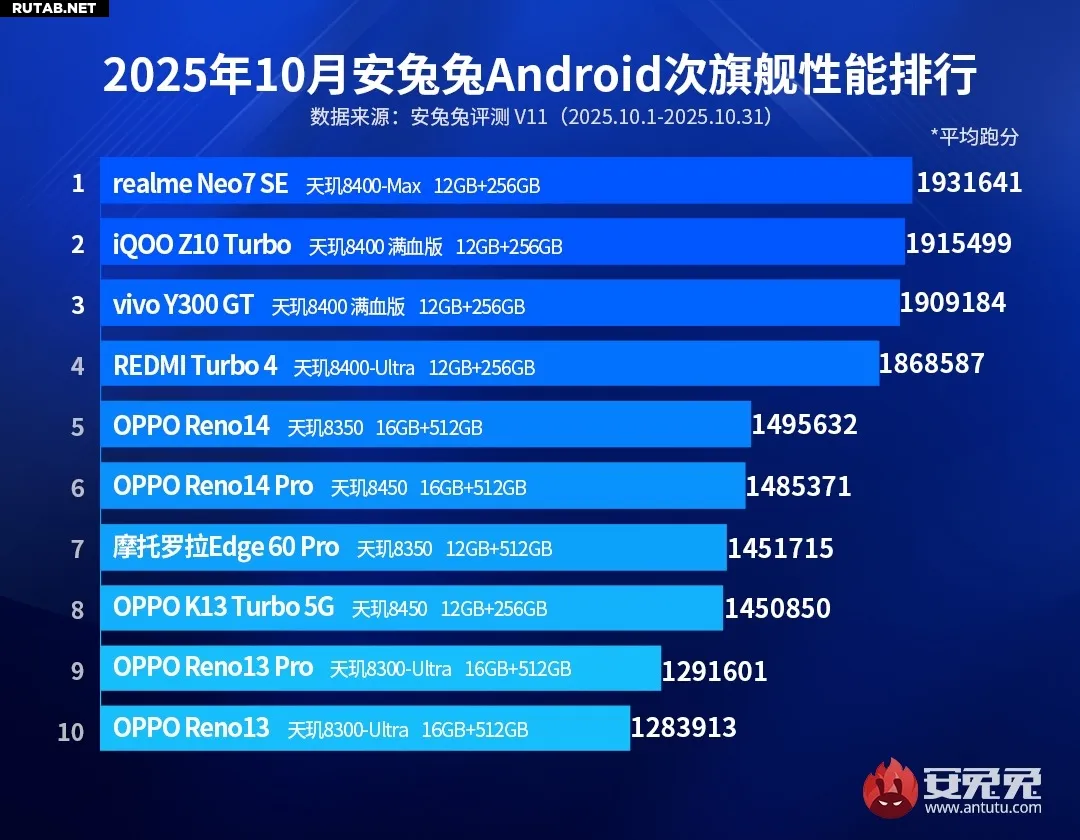 Две модели серии OPPO Reno14, оснащённые чипами Dimensity 8350 и 8450 соответственно, заняли пятое и шестое места, продемонстрировав баланс между тонким и лёгким корпусом и энергоэффективностью. Такие модели, как Motorola Edge 60 Pro и OPPO K13 Turbo 5G, также успешно вошли в десятку лучших, при этом их средний балл всё ещё превышает 1,28 миллиона баллов, что демонстрирует исключительно высокую общую производительность.