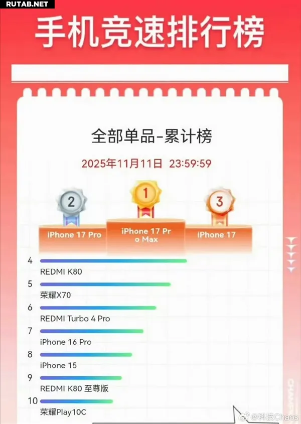 Во время недавней распродажи Double 11 серия iPhone 17 от Apple показала исключительные результаты на рынке. Согласно статистике китайского маркетплейса JD.com, три модели серии iPhone 17 (iPhone 17 Pro Max, iPhone 17 Pro и iPhone 17) вошли в тройку лидеров продаж во всех ценовых диапазонах. В сегменте премиум-устройств с ценой выше 6000 юаней эти модели также сохранили лидирующие позиции.