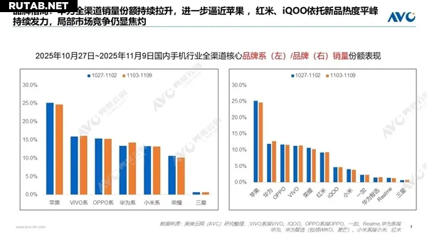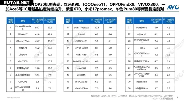 Huawei продолжила демонстрировать высокие результаты: продажи компании выросли по сравнению с четвёртой неделей распродаж «Double 11», что позволило занять второе место. Рекламные кампании таких моделей, как Mate 70 Pro и Pura 80, принесли значительные результаты.