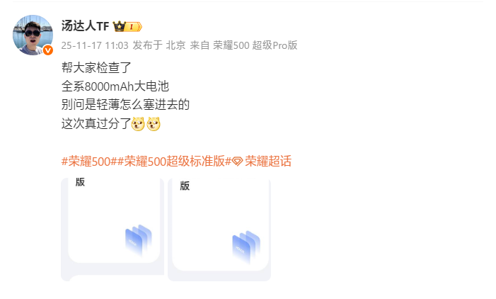 Менеджер по продукту Honor под ником @汤达人TF сообщил, что новинки серии Honor 500 получат аккумуляторы ёмкостью 8000 мАч.