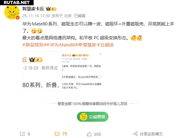 Другой блогер, «智慧皮卡丘», также подтвердил, что серия Mate 80 будет поддерживать магнитное кольцо и совместима со съемными магнитными чехлами. Главной особенностью серии станет сетевая коммуникационная архитектура.