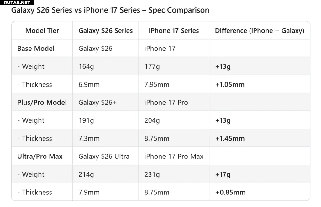 Инсайдер под ником @UniverseIce опубликовал в X сравнительную таблицу с довольно неожиданными цифрами. Согласно утечке, ожидается, что Galaxy S26 будет весить 164 грамма, S26+ — около 191 грамма, а S26 Ultra — примерно 214 грамм. Это делает базовую модель S26 и версию Ultra немного легче их эквивалентов в серии S25, в то время как S26+ прибавил всего один грамм, что по сути незначительно.