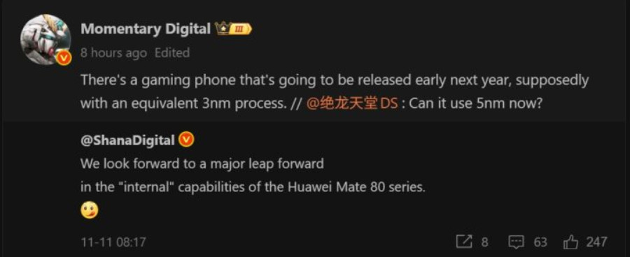Новая утечка из Китая теперь утверждает, что этот чип может также использоваться в игровом телефоне. Китайский инсайдер Satsuna Digital в Weibo предполагает, что Kirin 9030 может появиться внутри игрового смартфона Huawei ориентировочно в начале 2026 года.