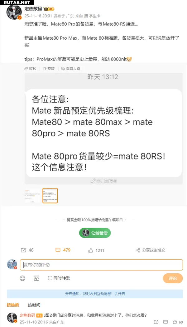 Другой блогер, «数码闲聊站», также раскрыл пропорции поставок серии Mate 80 для офлайн-продаж: объемы распределяются следующим образом: стандартная версия > версия Pro Max > RS Ultimate Master ≥ версия Pro.