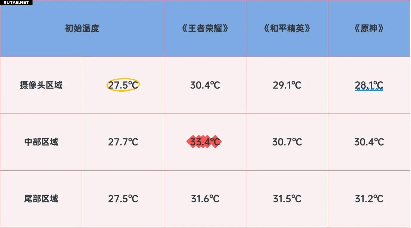 После двух матчей в «Honor of Kings» температура в различных зонах поднялась лишь до 28,1°C–30,4°C; после одного раунда в «PUBG Mobile» максимальная температура была зафиксирована в зоне камеры — 33,4°C.