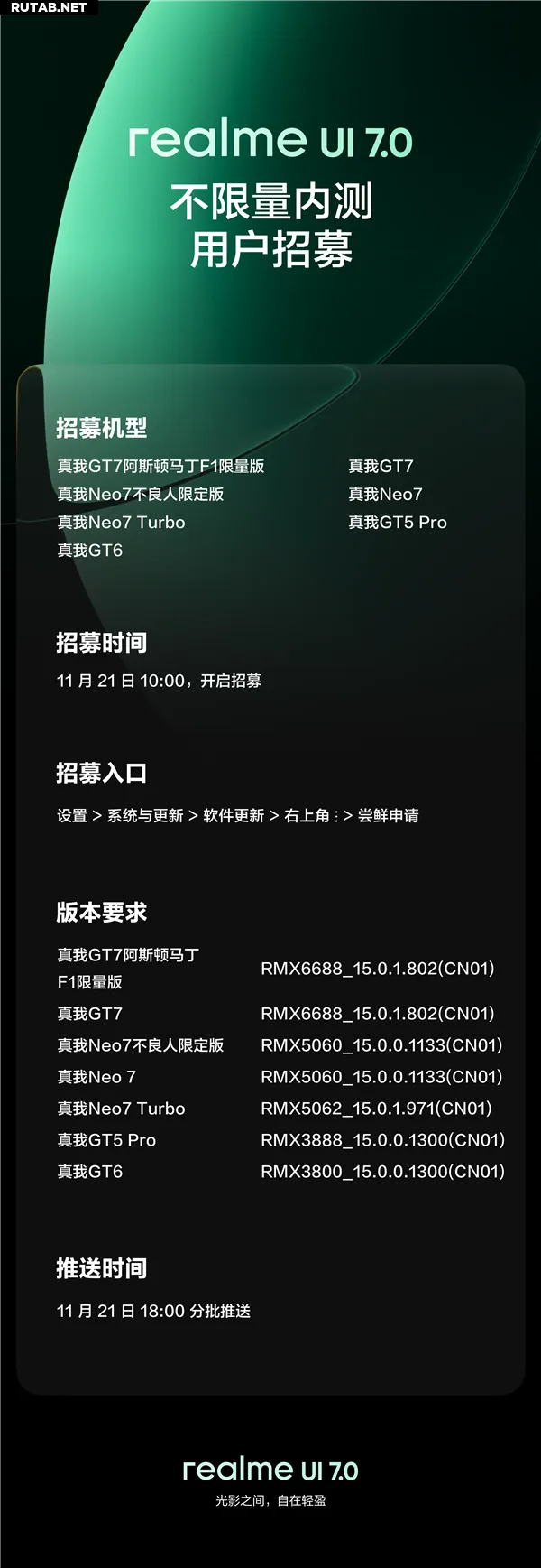 Согласно официальному заявлению, после тщательной оценки состояния версии, общего опыта и производительности инженерами, для участия в неограниченном бета-тестировании были выбраны следующие модели: Realme GT7 Aston Martin F1 Limited Edition, Realme GT7, Realme Neo7 Bubaren Limited Edition, Realme Neo7, Realme Neo7 Turbo, Realme GT5 Pro и Realme GT6.