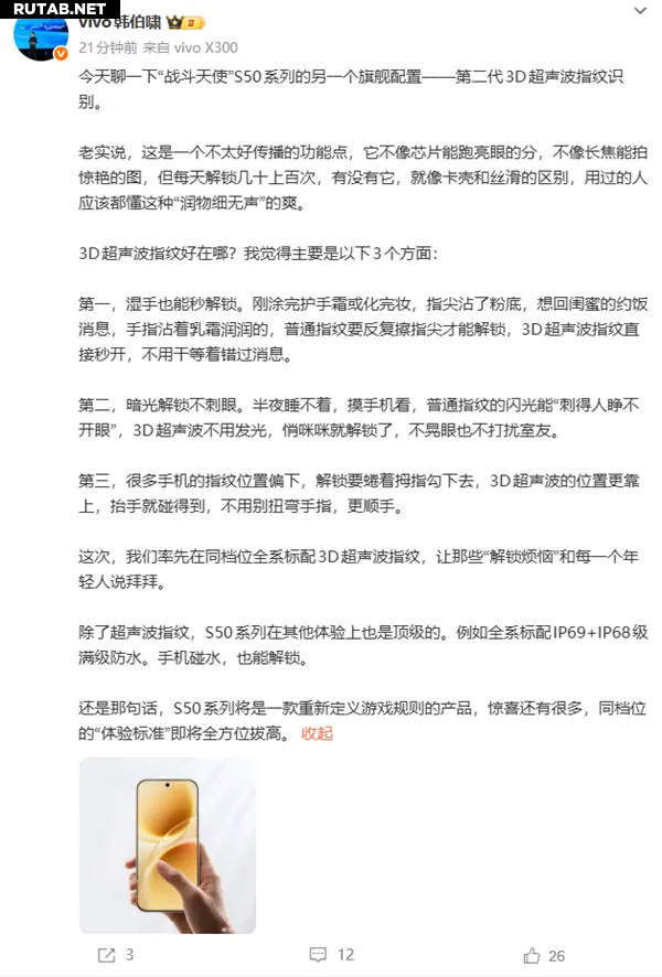 Менеджер по продукции vivo Хан Боксяо заявил, что это сделает серию S50 первым смартфоном в своем ценовом диапазоне со стандартным ультразвуковым сканером отпечатков.