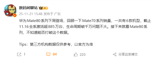 Инсайдер «Digital Chat Station» опубликовал данные о продажах серии Mate 70. По состоянию на 16 ноября общее количество активированных устройств всей серии превысило 8,85 миллиона.