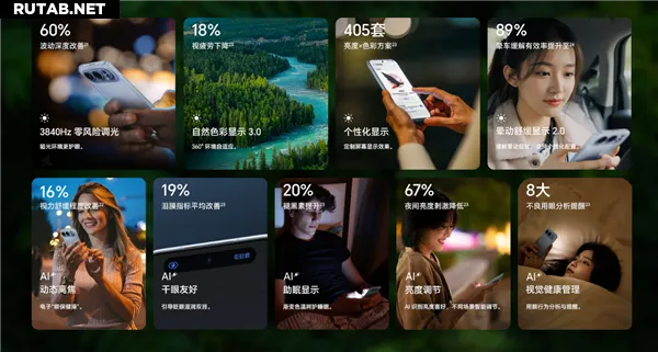 Экран обладает частотой обновления 120 Гц, поддерживает сверхвысокочастотную ШИМ-регулировку яркости 3840 Гц, пиковую яркость локальных зон 6000 нит, общую пиковую яркость 1800 нит и минимальную регулируемую яркость 1 нит. Он также поддерживает технологию AI Defocus Eye Protection и имеет сертификат TÜV Rheinland за отсутствие мерцания.