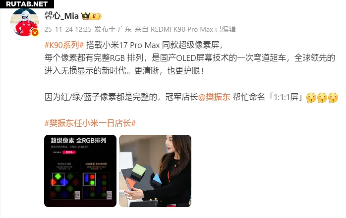 Менеджер по продукции Redmi Ху Синьсинь сообщил, что Фань Чжэньдун помог назвать экран SuperPixel для серии Redmi K90 — «экран с соотношением 1:1:1».