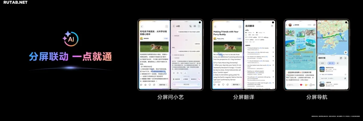 Складной экран Huawei Mate X7 тесно интегрирован с возможностями искусственного интеллекта HarmonyOS 6. Функция разделения экрана повышает эффективность многозадачности — при просмотре веб-страниц Xiaoyi может автоматически разделять экран для выполнения поиска без переключения между приложениями.