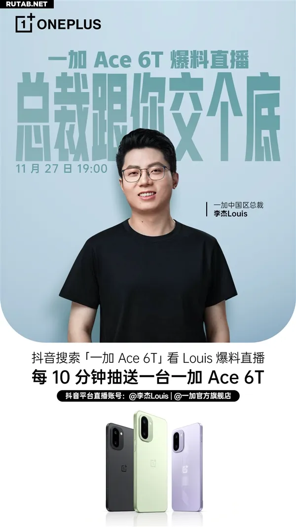Президент OnePlus в Китае Ли Цзе (Li Jie) анонсировал специальный прямой эфир, который состоится 27 ноября в 19:00 по пекинскому времени (14:00 МСК). В ходе трансляции будут раскрыты ключевые детали о готовящемся к выпуску смартфоне OnePlus Ace 6T.