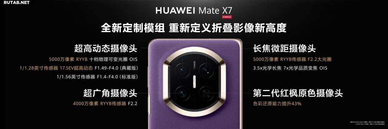 Камеры — еще один ключевой элемент Huawei Mate X7. Смартфон оснащен системой изображения Red Maple второго поколения. Основной датчик — 50 Мп RYYB с диагональю 1/1,28 дюйма и десятиступенчатой физической переменной апертурой. Телеобъектив также имеет разрешение 50 Мп RYYB, поддерживает 3,5-кратное оптическое приближение и оснащен оптической стабилизацией. Сверхширокоугольная камера — 40 Мп RYYB.