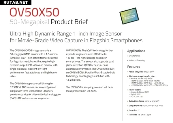 Этот сенсор, вероятно, является ранее анонсированным OV50X, выпуск которого начался в апреле этого года. Он обладает разрешением 50 мегапикселей, размер пикселя составляет 1,6 микрона. Сенсор специально разработан для флагманских смартфонов и оснащен однодюймовым оптическим форматом, обеспечивающим HDR с одиночной экспозицией до 110 дБ.