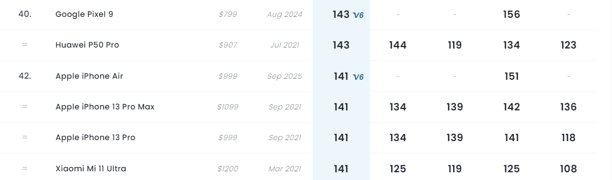 iPhone Air получил оценку 141 балл от DxOMark, сравнявшись с iPhone 13 Pro и Xiaomi 11 Ultra