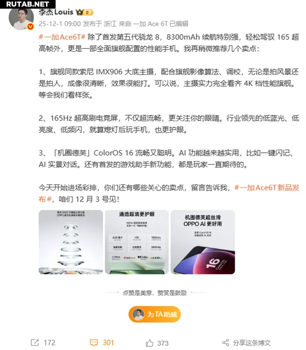Президент OnePlus в Китае Ли Цзе (Li Jie) объявил, что OnePlus Ace 6T оснастит основной камерой на сенсоре Sony IMX 906, который используется в топовых моделях. По его словам, благодаря флагманским алгоритмам обработки изображений и настройкам, камера обеспечит чёткие снимки как пейзажей, так и портретов.