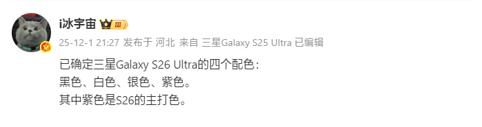 Блогер iIceUniverse подтвердил, что флагманский смартфон Samsung Galaxy S26 Ultra будет доступен в четырех цветах: черном, белом, серебристом и фиолетовом, причем фиолетовый станет основным цветом модели.
