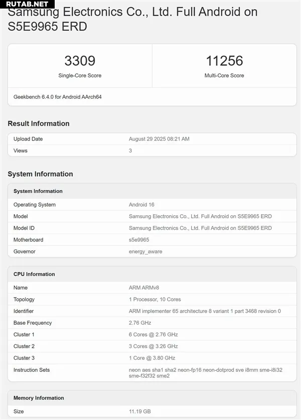 Exynos 2600 будет иметь 10-ядерную архитектуру: одно суперъядро с частотой 3,80 ГГц, три больших ядра с частотой 3,26 ГГц и шесть малых ядер с частотой 2,76 ГГц. По предварительным данным, его одноядерный результат в тестах превышает 3400 баллов, а многоядерный — 11 000 баллов.