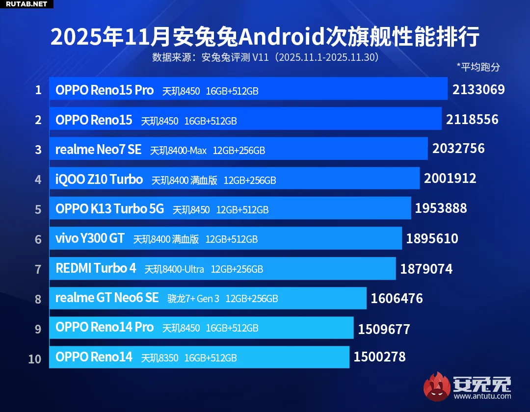 Остальные позиции в рейтинге заняли устройства на базе чипов серии Dimensity 8400. Первые два места достались OPPO Reno15 и OPPO Reno15 Pro, которые набрали более 2,11 миллиона баллов благодаря процессору Dimensity 8450.