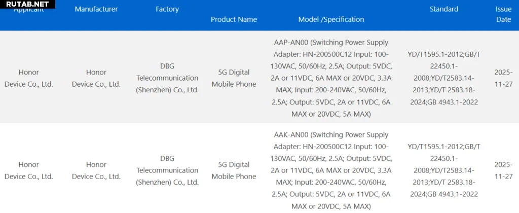 В документах указаны модели AAK-AN00 и AAP-AN00. Ключевой деталью сертификации стало подтверждение поддержки быстрой проводной зарядки мощностью 100 Вт для обоих устройств. Это указывает на значительное улучшение скорости подзарядки по сравнению с предыдущими моделями линейки GT.