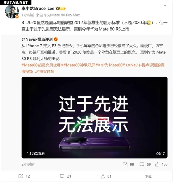 Главный технический директор подразделения потребительских устройств Huawei Ли Сяолун (Li Xianglong) заявил, что новый флагманский смартфон Mate 80 RS стал первым в мире мобильным устройством, реализовавшим поддержку продвинутого стандарта цветового охвата BT.2020.