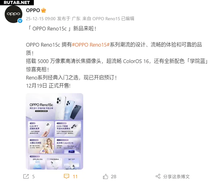 Компания OPPO официально представила модель Reno15c, которая станет самой доступной в новой линейке Reno15. Продажи устройства стартуют 19 декабря.