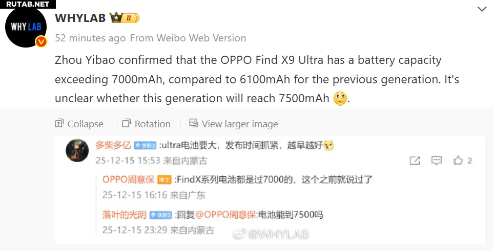 На вопрос пользователя Weibo о ёмкости аккумулятора Find X9 Ultra Ибао ответил словами «беспрецедентно мощный». В другом посте в соцсети представитель Oppo уточнил, что ёмкость будет «значительно больше 7000 мАч».