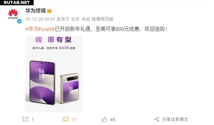 Компания Huawei объявила о новогодней акции на складной смартфон Huawei Pura X, предложив скидки до 800 юаней.