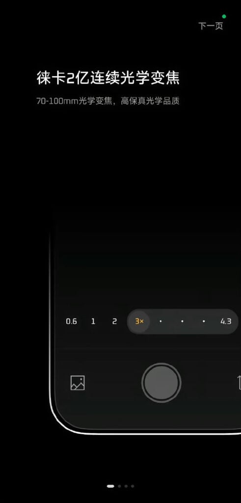 На изображениях видны стандартные пресеты зума: 0.6x, 1x и 2x. Однако в телефото-секции, судя по всему, будет доступен плавный зум в диапазоне от 3x до 4.3x, что покрывает фокусные расстояния от 70 до 100 мм. Интерфейс также содержит упоминания системы «Leica 200MP continuous optical zoom», что указывает на настоящую оптическую регулировку, а не на решение с несколькими объективами.