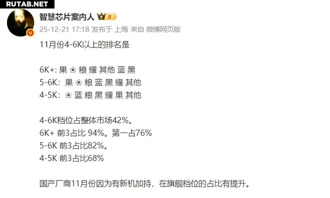 Блогер «智慧芯片案内人» опубликовал данные о продажах премиальных смартфонов в Китае за ноябрь, разделив их на три ценовых сегмента: от 6000 юаней, от 5000 до 6000 юаней и от 4000 до 5000 юаней.